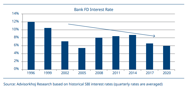FD and small savings schemes’ interest rates on declining trend Bank FD interest rates have generally been declining over the last 20 years, from 10 – 11% in 1999 to just around 6% in 2020.