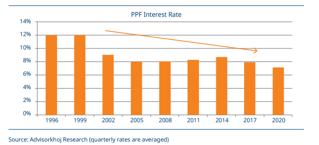 Similarly, Government (Post Office) small savings schemes’ interest rates are also on a declining trend over the last 20 years from 12% to around 7% in 2020.